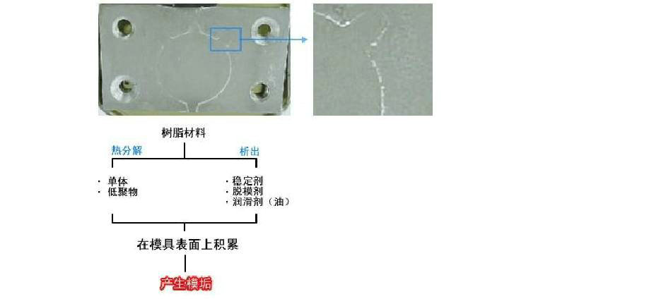 1) Różne dodatki powodują powstawanie specyficznych rodzajów osadów pleśni. Środek zmniejszający palność będzie reagował w wysokiej temperaturze, powodując rozkład i prawdopodobnie wytwarzając produkty z kamienia pleśniowego. Pod wpływem zbyt wysokiej temperatury lub ekstremalnej siły ścinającej środek przeciwudarowy oddzieli się od polimeru i pozostanie na powierzchni wnęki formy, tworząc zgorzelinę formy.