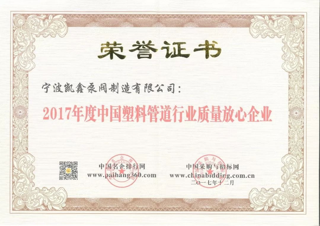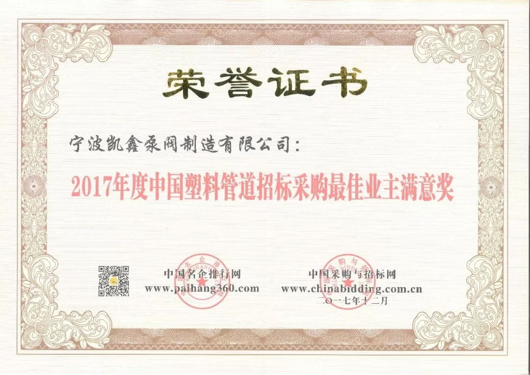 W akcji promocyjnej bierze udział ponad 180 firm. Łączna liczba odsłon działania to blisko 600W, a łączna liczba głosów to blisko 200W . Ningbo Kaixin Pump & Valve Manufacturing Co., Ltd. jest jedną z ponad 180 firm. Od kompilacji indlamacji rejestracyjnych na wczesnym etapie, poprzez codzienne, nieprzerwane głosowanie wszystkich pracowników firmy w połowie okresu, po kompleksową ocenę przez powiązane instytucje i specjalistów na późniejszym etapie, firma Kai Xin została wybrana i zdobyła 3 nagrody, a mianowicie: „Wiodąca marka w chińskim przemyśle rur z tworzyw sztucznych 2017”, „Chińskie przedsiębiorstwo zapewniania jakości przemysłu rur z tworzyw sztucznych 2017” oraz „Najlepszy właściciel chińskiego przetargu i zamówień na rury z tworzyw sztucznych w 2017 r.” Nagroda Satysfakcji”.