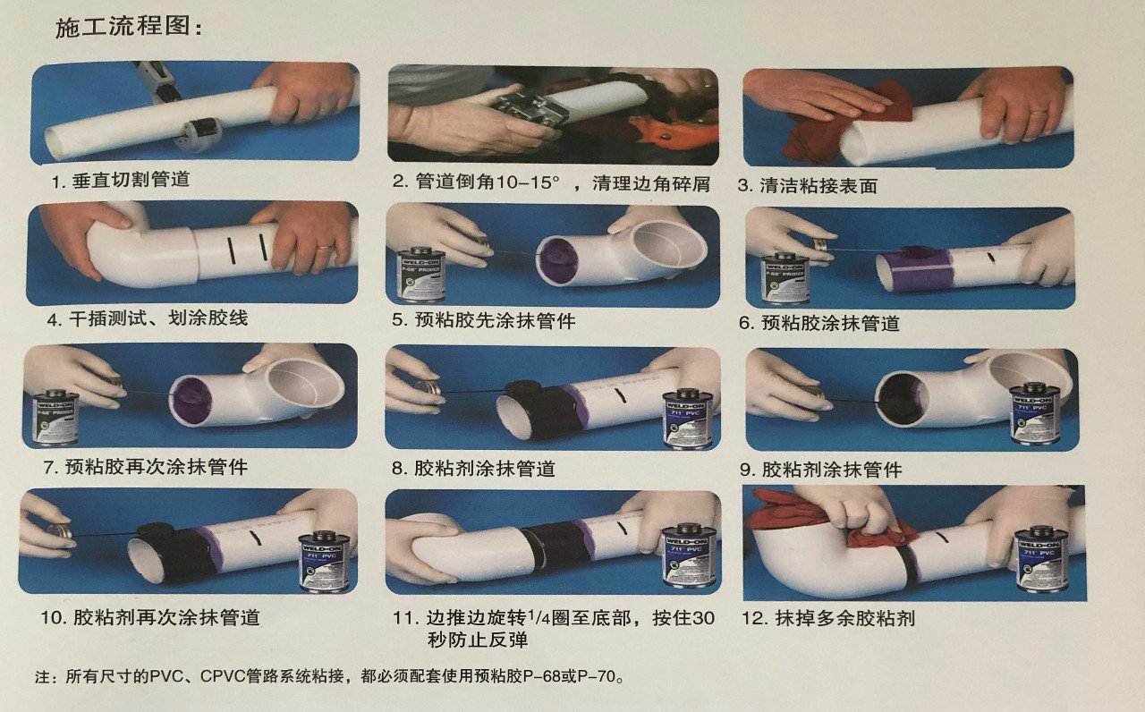 Natychmiast po nałożeniu kleju włóż rurkę do złączki i obróć ją o 1/4 obrotu. Rura musi stykać się z dolną częścią złączki. Kombinację interfejsu należy unieruchomić na 20 do 30 sekund, aby zapewnić wstępne połączenie (łączenie złączek powyżej DN150 przy użyciu specjalnego narzędzia do napinacza, które ułatwia zaciśnięcie i odstawienie na dłużej niż 15 minut). Wycieki kleju wokół połączeń rur i kształtek powinny być widoczne. Jeśli rozlany klej wokół węzła nie zostanie połączony, oznacza to, że nałożony klej jest niewystarczający. W takim przypadku zaleca się wyrzucenie akcesoriów i ponowne złożenie interfejsu. Nadmiar kleju można zetrzeć szmatką.