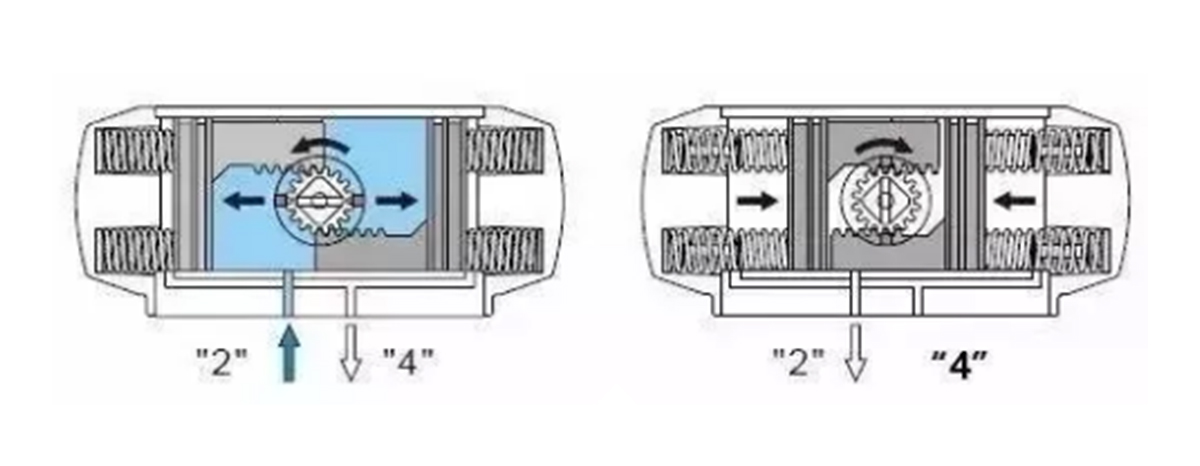 Kiedy ciśnienie źródła powietrza przedostaje się do wnęki pomiędzy dwoma tłokami cylindra z otworu powietrznego (2), oba tłoki zostają rozdzielone i przemieszczane w kierunku końców cylindra, zmuszając sprężyny na obu końcach do ściągnięcia, a powietrze z komór powietrznych na obu końcach jest usuwane przez otwór powietrzny (4). Zsynchronizuj dwie zębatki tłokowe, aby napędzać wał wyjściowy (przekładnię) i obracać się w kierunku przeciwnym do ruchu wskazówek zegara. Po odwróceniu ciśnienia źródła powietrza przez zawór elektromagnetyczny dwa tłoki cylindra poruszają się w kierunku środkowym pod wpływem siły sprężystej sprężyny, powietrze ze środkowej wnęki jest usuwane z otworu powietrznego (2), a dwie zębatki tłokowe jednocześnie napędzają wał wyjściowy (przekładnię). Obróć zgodnie z ruchem wskazówek zegara. (Jeśli tłok zostanie zamontowany w przeciwnym kierunku, po zresetowaniu sprężyny wał wyjściowy obróci się w odwrotnym kierunku).