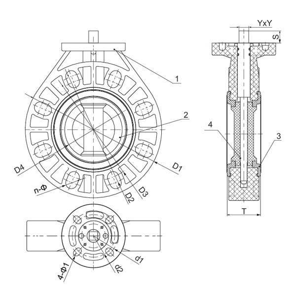 Specyfikacja D1 (mm) D2(mm) D3(mm) D4(mm) T(mm) n-Φ(mm) YxY (mm) S(mm) d1(mm) d2(mm) 4-Φ1 (mm)