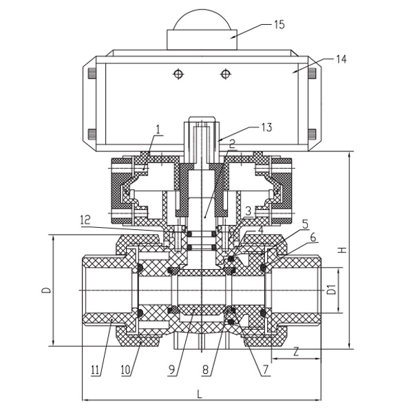 1. Te techniczne zawory kulowe z tworzywa sztucznego są formowane wtryskowo w jednym kawałku przy użyciu odpornych na korozję tworzyw termoplastycznych, takich jak FRPP, PVDF, PVC-C, PVC-U i PPH, zapewniających dużą odporność na korozję.